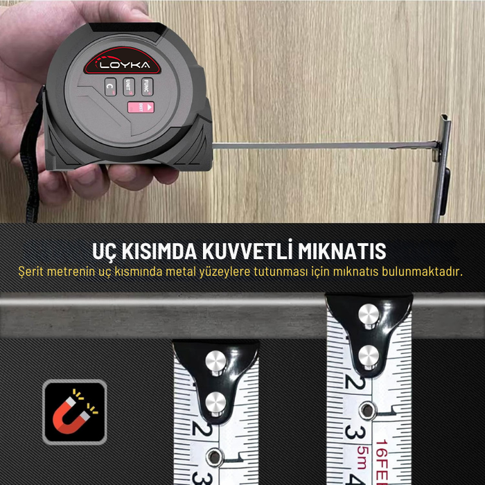 - Şerit metrenin uç kısmında metal yüzeylere tutunması için mıknatıs bulunmaktadır.