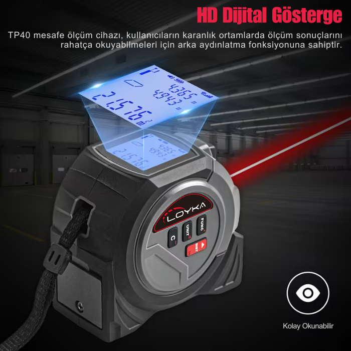 - Loyka TP40 cihazının lazermetre özelliği ile uzunluk, alan, hacim ve Pisagor ölçümlerine kadar tüm ölçümlerinizi anında ve kolayca yapabilirsiniz.